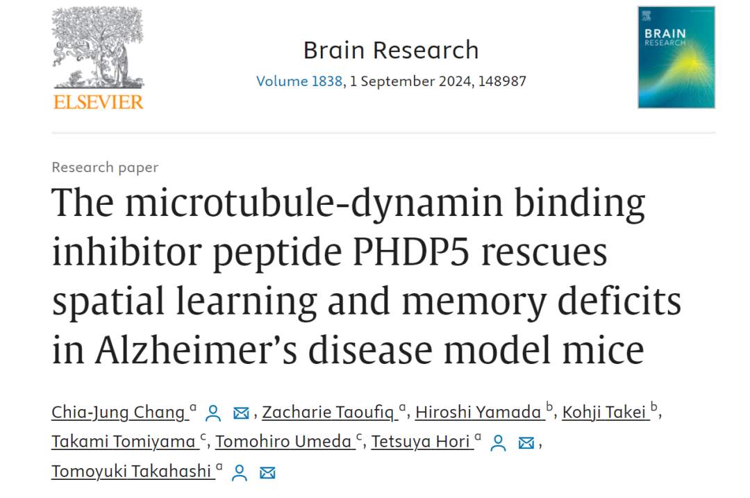 Chia-Jung Chang et al, The microtubule-dynamin binding inhibitor peptide PHDP5 rescues spatial learning and memory deficits in Alzheimer's disease model mice, Brain Research (2024). DOI: 10.1016/j.brainres.2024.148987