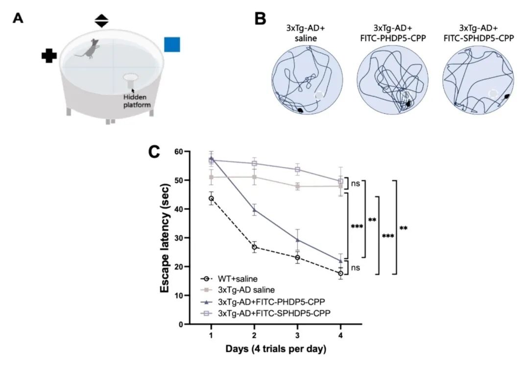 该论文的一些主要发现。SPHDP5 是一种无治疗效果的乱序肽,用作对照。A) 展示了使用莫里斯水迷宫的实验设置,其中将小鼠放入水浴中,并训练其使用视觉线索找到隐藏的平台。B) 是小鼠游向隐藏平台(白色虚线)的游泳路径的代表性插图。C) 显示了 PHDP5 鼻腔给药随时间推移的效果——请注意健康小鼠(黑色虚线)和用 PHDP5 治疗的转基因小鼠(带三角形的灰色线)的曲线非常相似