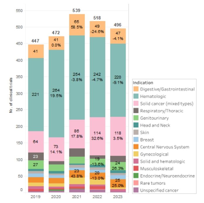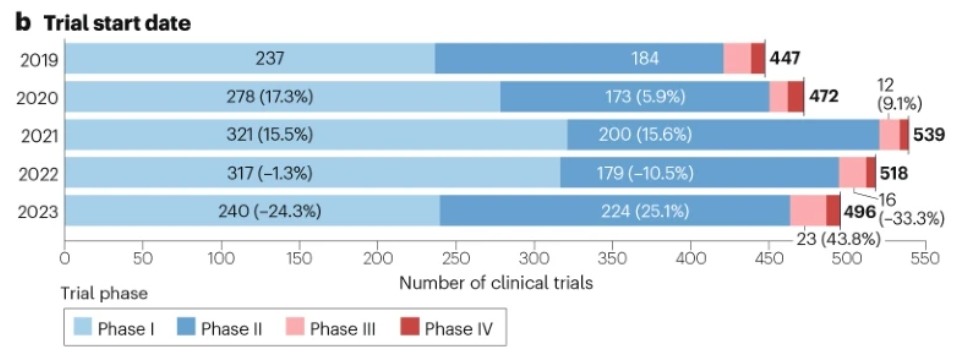 在过去的两年里,新的细胞治疗试验的数量有所减少。临床试验的数量在2021年达到峰值,此后在2022年下降了3.9%,在2023年下降了4.3%。尽管总体上有所减少,但三期试验在这两年分别增长了33.3%和43.8%,2022年至2023年的新试验总数仍超过2019年至2020年的数字。