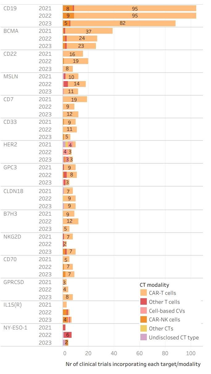 2023年,基于细胞的癌症疫苗、CAR-NK细胞和基于细菌的治疗药物相对于2022年有所增长,而CAR-T细胞和其他T细胞产品在该领域的份额减少。关于靶标,最常见的靶标仍然是CD19、BCMA和CD22,但它们在过去一年中有所减少。相比之下,其他靶标的试验增加,如CD7(33.3%)、HER2(14.3%)和NKG2D(233.3%)。