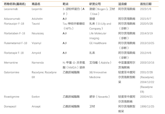 在2021年之前,FDA仅批准过6种治疗AD的药物,包括:他克林(Tacrine)、多奈哌齐(Donepezil)、卡巴拉汀(Revastigmine)、加兰他敏(Galantamine)、美金刚(Menantine)以及美金刚/多奈哌齐复方制剂。