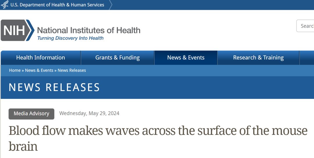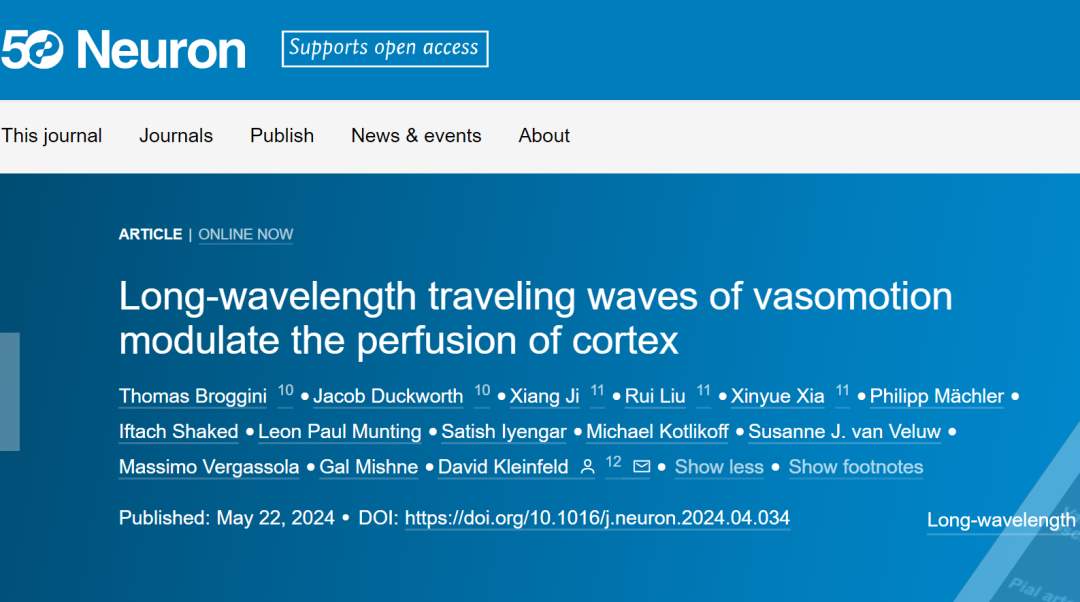 Thomas Broggini, Jacob Duckworth, Xiang Ji, Rui Liu, Xinyue Xia, Philipp Mächler, Iftach Shaked, Leon Paul Munting, Satish Iyengar, Michael Kotlikoff, Susanne J. van Veluw, Massimo Vergassola, Gal Mishne, David Kleinfeld. Long-wavelength traveling waves of vasomotion modulate the perfusion of cortex. Neuron, 2024; DOI: 10.1016/j.neuron.2024.04.034