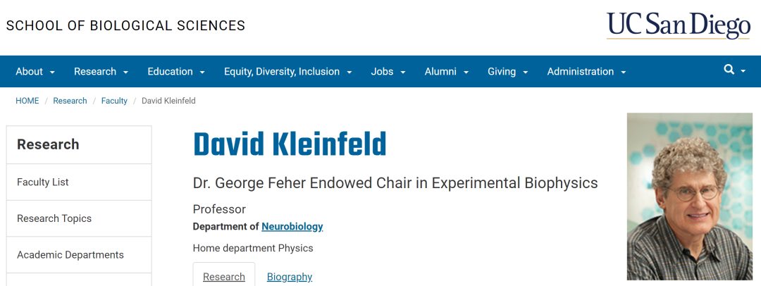 该研究通讯作者UCSD生物科学学院神经生物系 David Kleinfeld 教授