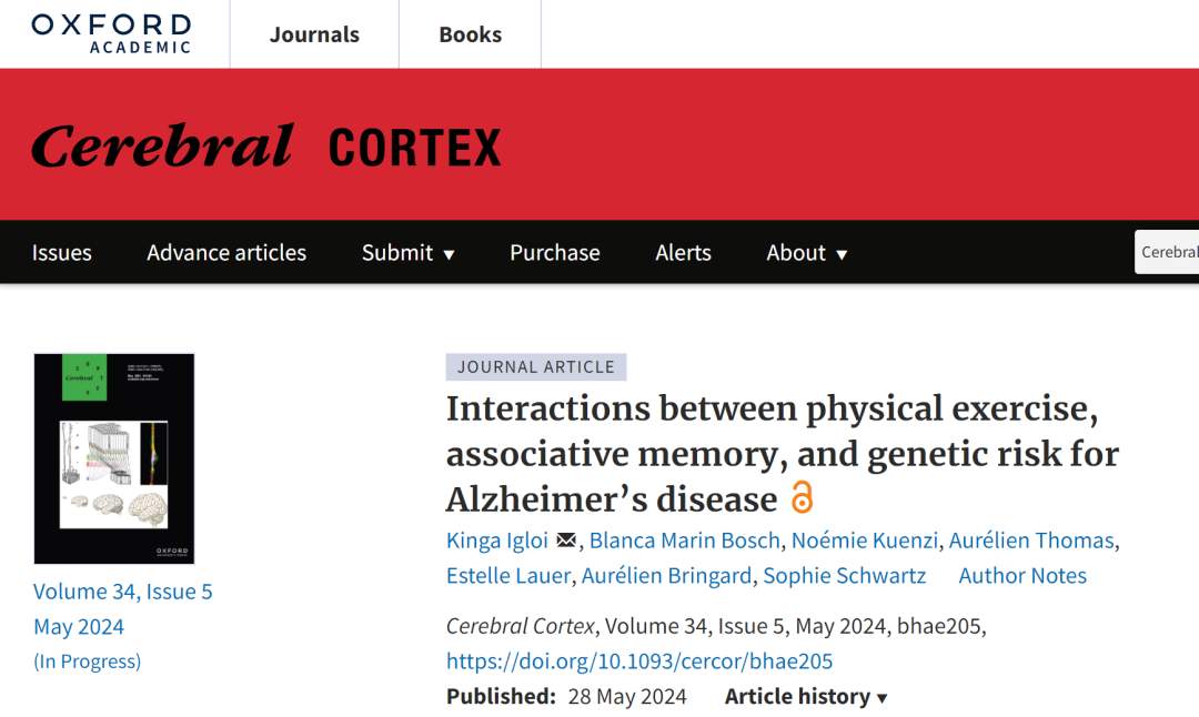Kinga Igloi, Blanca Marin Bosch, Noémie Kuenzi, Aurélien Thomas, Estelle Lauer, Aurélien Bringard, Sophie Schwartz, Interactions between physical exercise, associative memory, and genetic risk for Alzheimer’s disease, Cerebral Cortex, Volume 34, Issue 5, May 2024, bhae205, https://doi.org/10.1093/cercor/bhae205