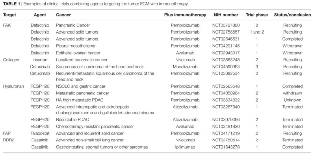 肿瘤相关ECM可通过多种方式进行治疗靶向,包括靶向ECM分子、ECM重塑酶、改变基质的结构或物理性质,或调节成纤维细胞功能。目前,有多项与ICI的联合研究处于临床阶段。