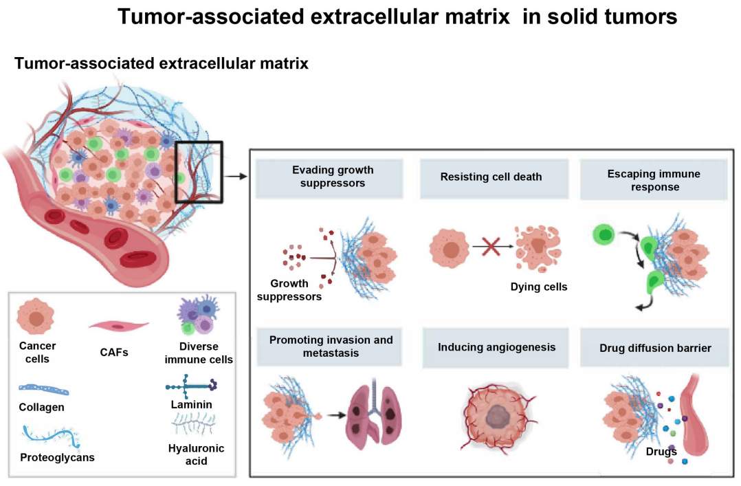 在过去的几十年里,我们了解到,慢性炎症的肿瘤微环境(TME)在肿瘤免疫抑制中起主要作用。而肿瘤相关细胞外基质(ECM)作为TME的核心成员,成为近年来的研究热点。越来越多的研究表明,肿瘤相关ECM是获得更成功的癌症免疫治疗病例的主要障碍之一。