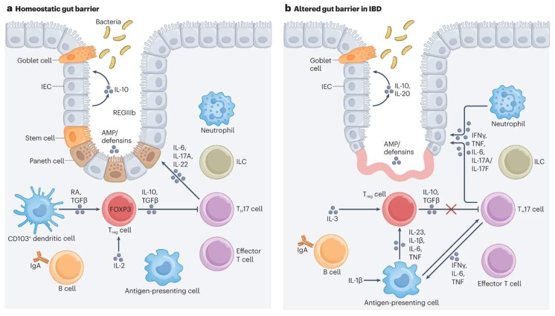在稳态条件下,肠道同时产生促炎和抗炎细胞因子。促炎细胞因子,如IFN-γ,可促进先天免疫细胞的活化和细胞毒性功能,并保护肠道免受病原体感染。相反,抗炎细胞因子如IL-10和转化生长因子-β(TGF-β)控制调节性T(Treg)细胞反应的激活和扩增,对预防肠道中过度的炎症反应很重要。肠道中促炎和抗炎细胞因子产生之间的这种平衡是维持肠道稳态的核心。因此,深刻了解肠道细胞因子网络的紊乱与IBD的关系,将有助于我们开发针对IBD的免疫治疗药物,并为IBD提供了新的免疫治疗手段。