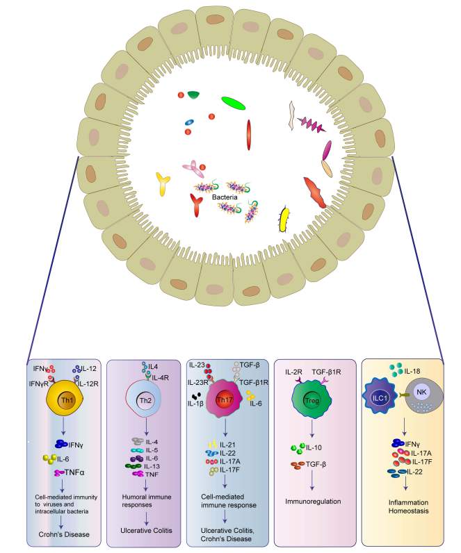 在稳态过程中,细胞因子由肠道中的免疫细胞和非免疫细胞群体产生。ILCs是天生的类免疫细胞,可产生各种细胞因子。根据其细胞因子谱,ILCs被分为三个主要亚群(ILC1、ILC2和ILC3),这三个亚群对应于具有相似细胞因子表达谱的辅助T细胞亚群:分别为TH1细胞、TH2细胞和TH17细胞。