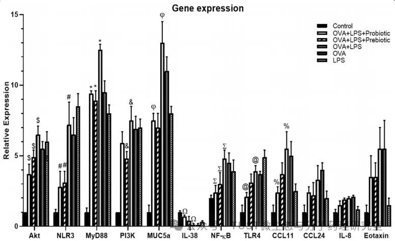 2、益生菌和益生元可控制细胞因子(IL-4、5、13、25和33)、白三烯、AKT、NLR3、NF-κB、MyD88、MUC5a的基因表达、支气管周围炎症并增加IL-38基因表达。