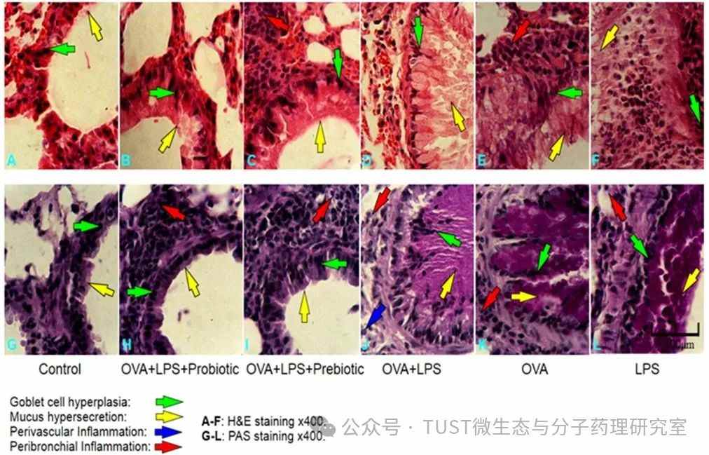1、益生菌可控制AHR、嗜酸性粒细胞向血管周围和BALF的浸润、免疫球蛋白、IL-17、GTP水平以及粘液分泌、杯状细胞增生、EPO活性。可降低TLR4、CCL11基因表达。