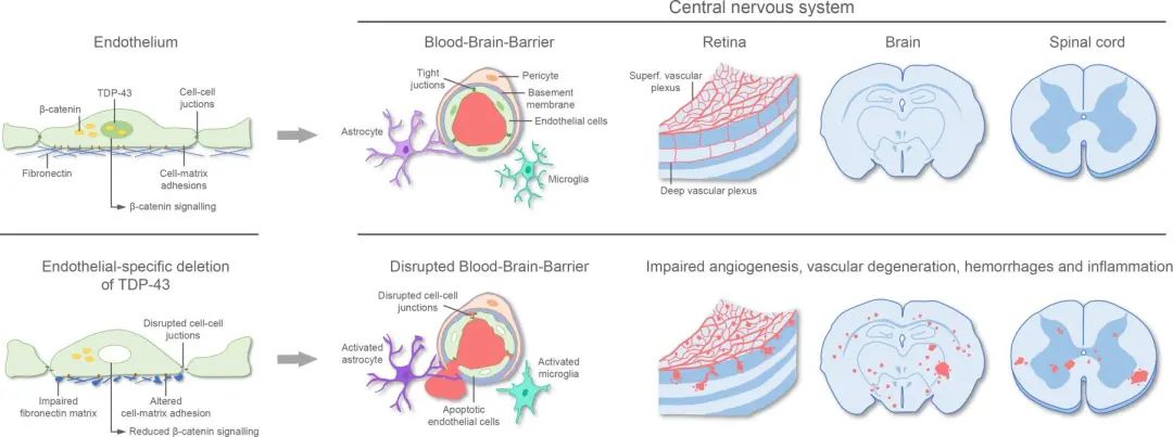 作者还发现内皮细胞中的 TDP-43 是血管缺陷的一个潜在促成因素,血管缺陷触发了在诊断为 TDP-43 相关疾病的患者中观察到的炎症反应。