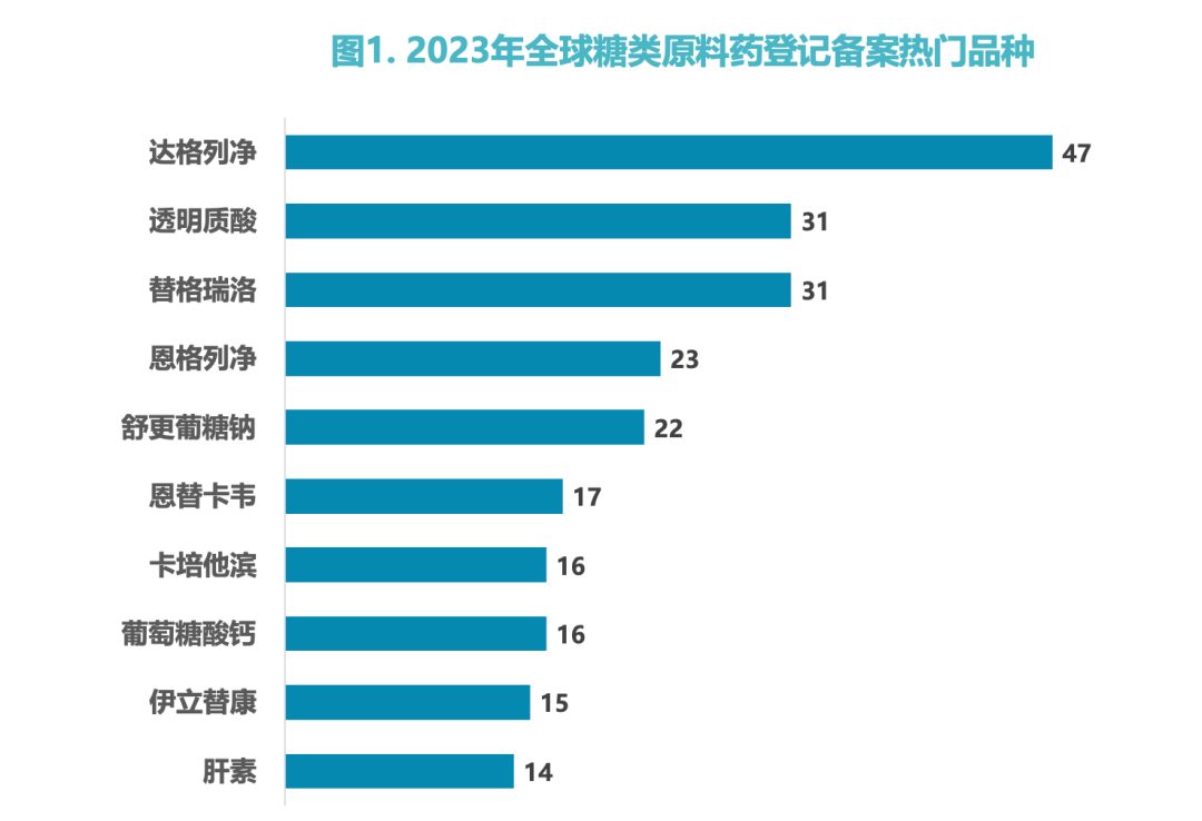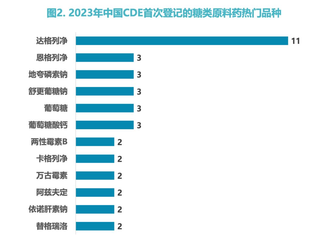 国内2023年首次登记的糖类原料药最热门品种是达格列净,登记数达11个。