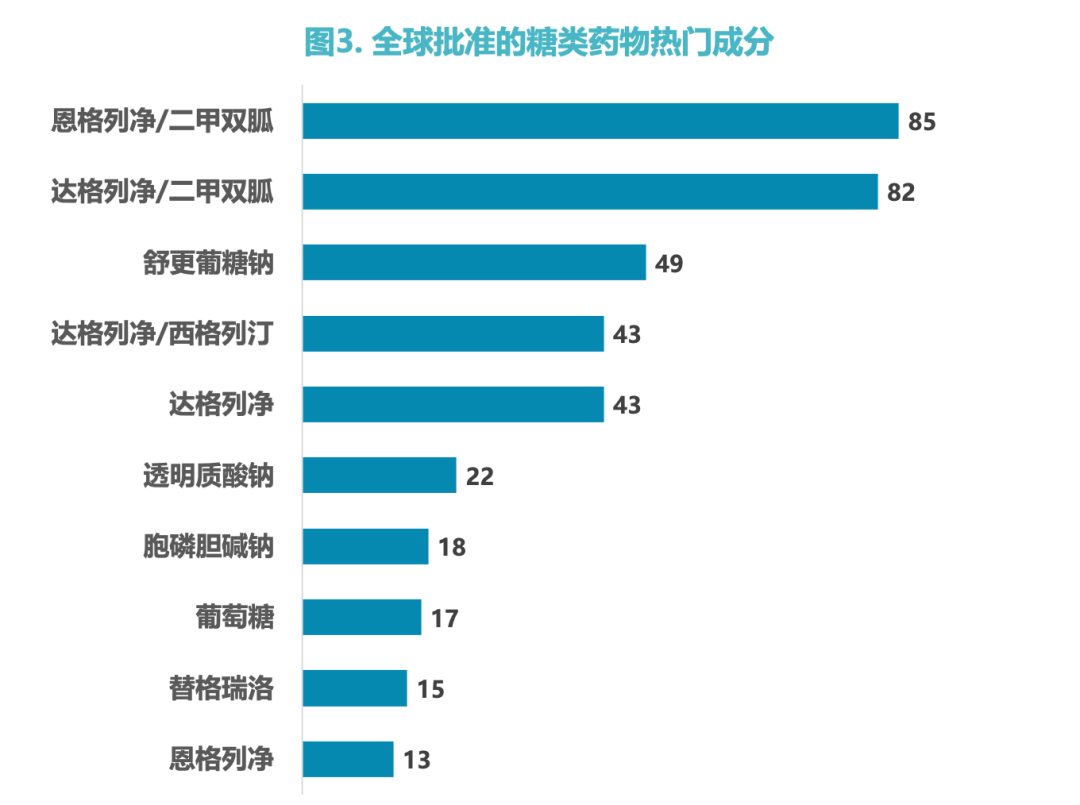 2023年全球(中美欧日韩澳新) 7大监管机构公发布638个糖类药物的上市批件。从获批糖类药物主要活性成分看,恩格列净排名第一,其次是达格列净丙二醇和舒更葡糖钠。