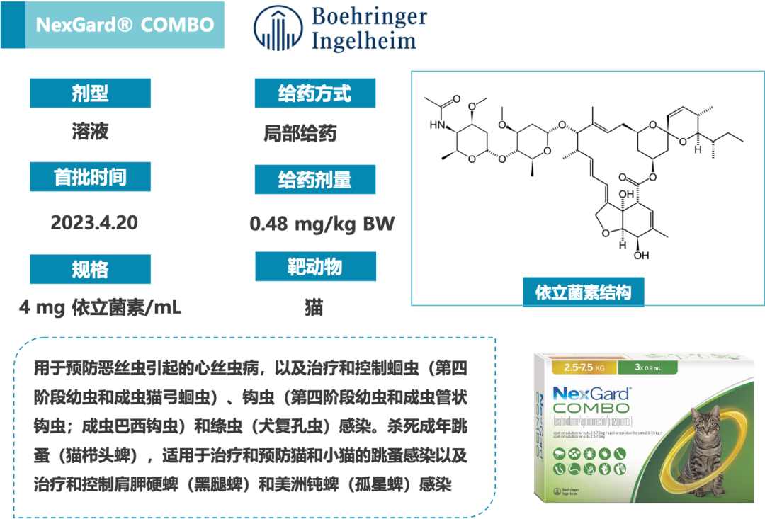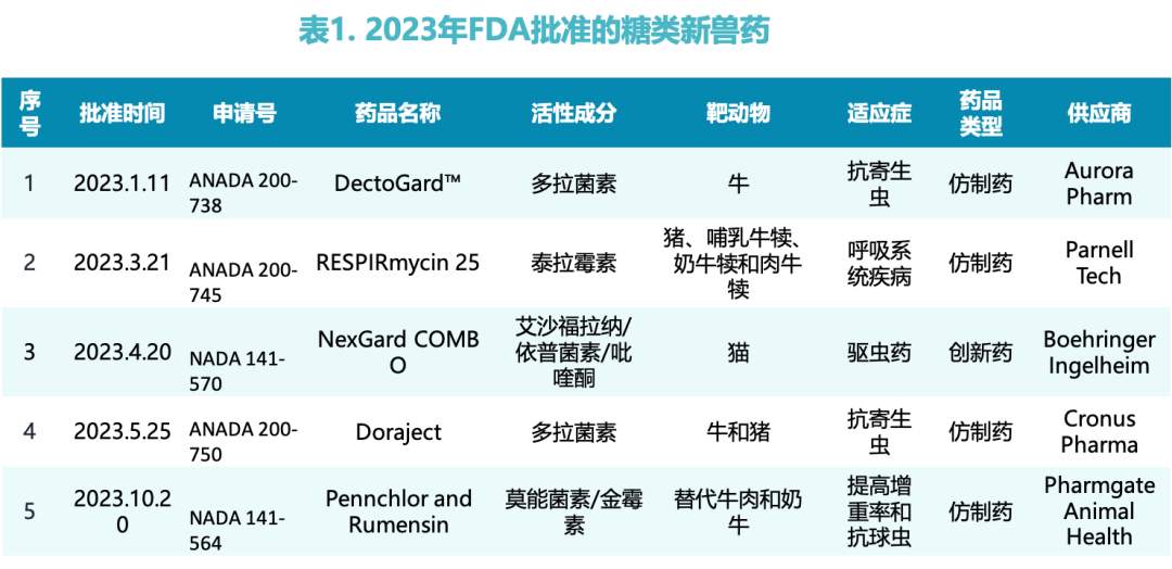 2023年,美国FDA共批准了48款新兽药,其中5款含糖类分子,占比10%,共涉及4个糖类分子。FDA新批准的5款糖类兽药如下: