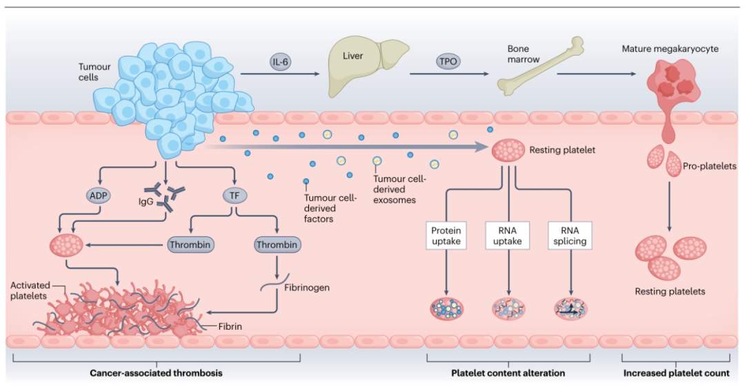 研究表明,肿瘤细胞分泌的刺激因子,如血小板激动剂二磷酸腺苷(ADP)和IgG,或功能蛋白和RNA,可导致血小板蛋白质组和转录组特征的显著变化,增加血小板的促凝血、促血管生成和促转移特性。循环中的血小板也能够主动吸收肿瘤衍生的蛋白质和mRNA,导致血小板的血小板衍生生长因子(PDGF)、TGF-β和基质金属蛋白酶1(MMP1)水平升高。