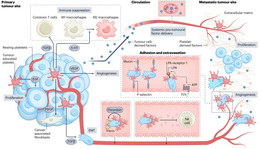 在原发性肿瘤中,血小板通过分泌表皮生长因子(EGF)维持肿瘤细胞增殖。此外,血小板衍生的TGF-β和血清素(5-HT)通过阻碍T细胞功能和促进M1巨噬细胞向M2表型的转变,促进免疫抑制微环境。血小板还通过分泌血管内皮生长因子(VEGF)促进血管生成,通过分泌TGF-β促进肿瘤细胞上皮-间质转化(EMT)。血小板衍生生长因子(PDGF)可以募集癌症相关的成纤维细胞,导致细胞外基质过度沉积,从而阻碍免疫细胞的肿瘤内浸润。