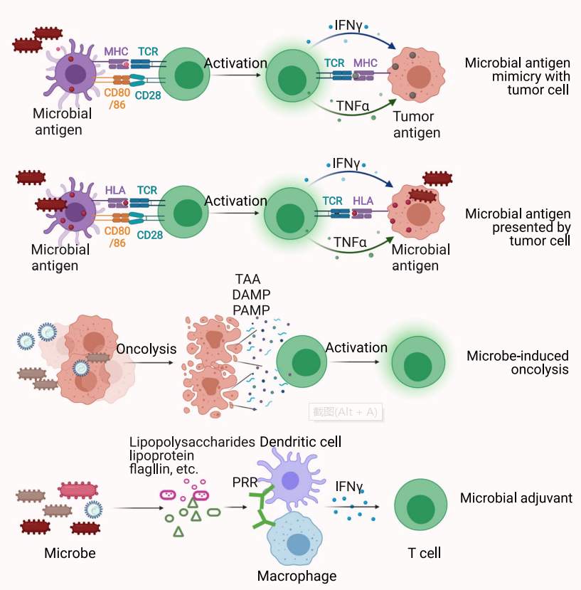多项研究已经观察到肿瘤内微生物与肿瘤微环境之间的相关性。最近的研究表明肿瘤微生物微环境作用于肿瘤微环境存在多种机制,包括:(I)癌细胞和免疫细胞呈递细菌肽,(II)细菌抗原模拟肿瘤抗原(III)微生物诱导的免疫原性细胞死亡(IV)辅助模式识别受体介导的信号通路(V)微生物衍生代谢物(VI)刺激抑制性检查点。