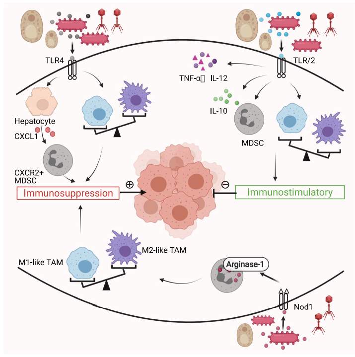 首先,肿瘤内微生物通过TLR驱动免疫抑制肿瘤微环境的形成。在患有胰腺癌的小鼠模型中,肿瘤内微生物选择性激活单核细胞中的TLR,以诱导M2样TAM分化。TLR4识别的细菌脂多糖诱导肝细胞表达CXCL1,CXCL1是一种趋化因子,可招募CXCR2+多形核MDSC形成免疫抑制环境,促进小鼠胆管癌。类似地,TLR4识别的梭杆菌上调IL-6/p-STAT3/c-MYC信号通路,导致M2样TAM极化和结直肠癌进展。