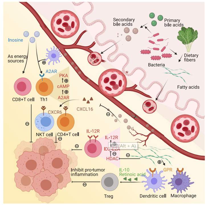 微生物代谢产物如短链脂肪酸(SCFA)、胆汁酸和肌苷可进入血液。一些微生物源性代谢产物的受体在癌细胞和肿瘤浸润的免疫细胞上表达,表明微生物源性代谢产物在肿瘤微环境中的潜在作用。