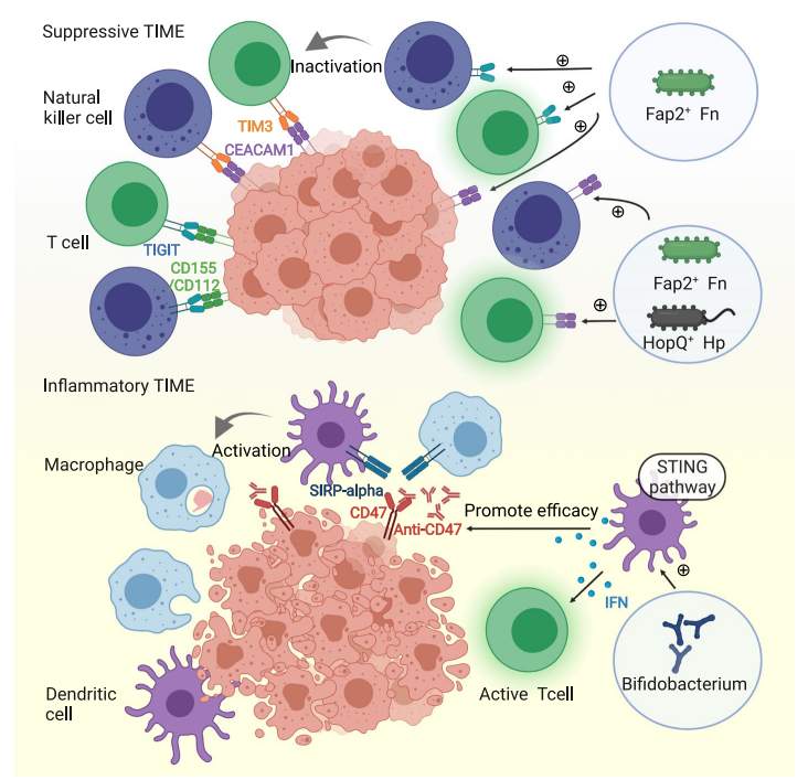 有核梭杆菌通过Fap2和TIGIT之间的相互作用或Fap2和CEACAM1之间的相互作用抑制自然杀伤细胞和细胞毒性T细胞的活性。幽门螺杆菌通过其外膜蛋白HopQ作用于CEACAM1,抑制免疫细胞。除了幽门螺杆菌和核梭杆菌外,其他细菌,如致病性奈瑟菌,也能与CEACAM1结合。
