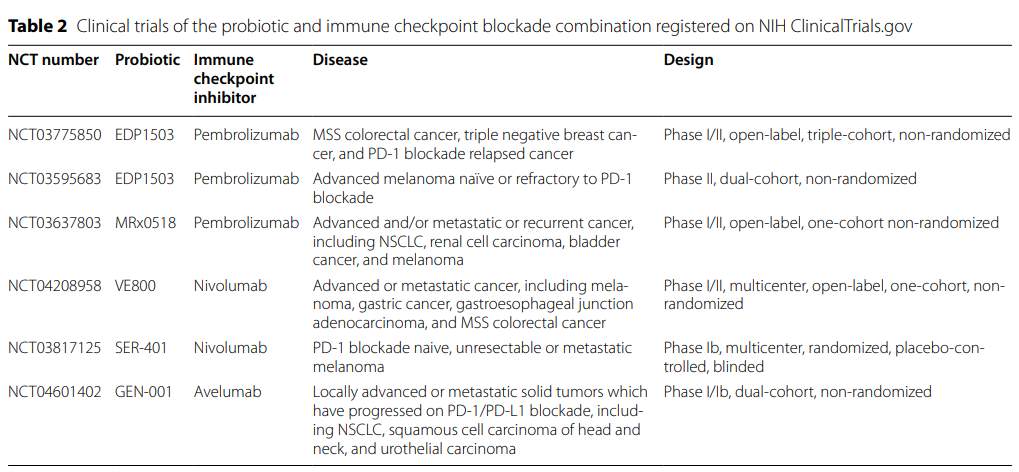 目前,正在进行几项将益生菌和ICIs相结合的临床试验。已发现口服益生菌通过多效性机制恢复抗癌免疫和ICIs功效。然而,口服益生菌引起的肿瘤微生物微环境的变化尚不明确,因此需要在未来的临床试验中检测。