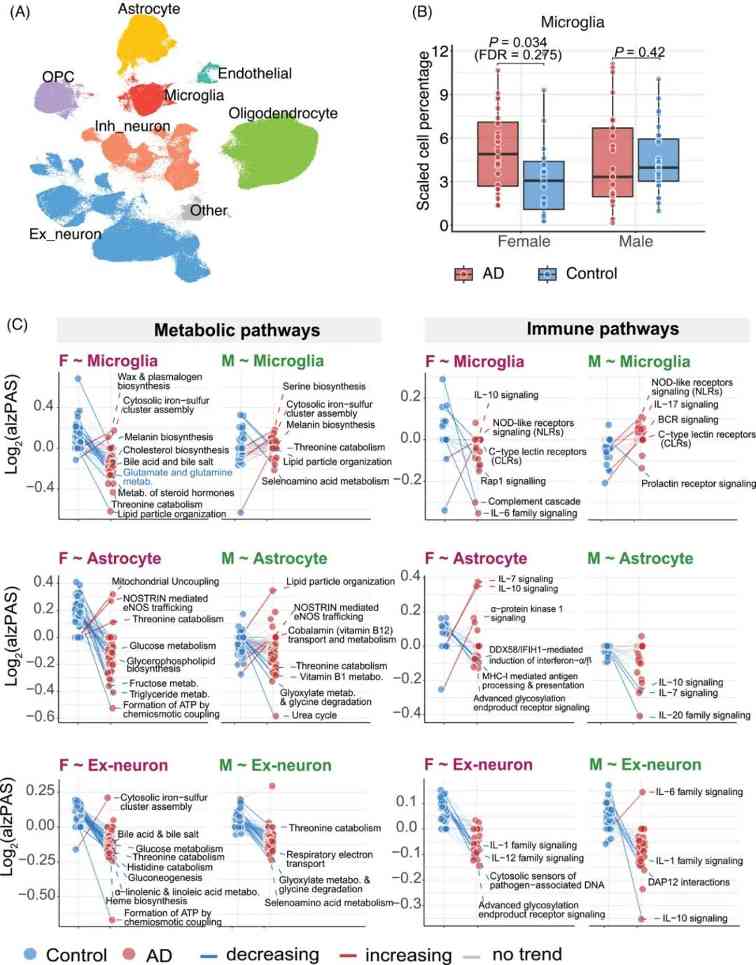 他们寻找了男性和女性在免疫功能、细胞代谢、脑细胞之间交流等方面的基因表达变化。他们发现所有三个区域都存在性别差异,其中在大脑中的免疫细胞小胶质细胞中有显著差异。与男性患者相比,女性患者脑内小胶质细胞的变化更大。