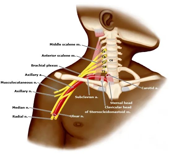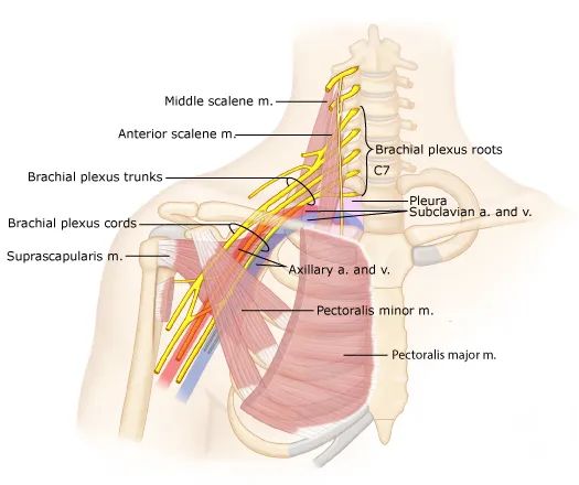 臂丛神经由下颈神经根和上胸神经根的腹侧支组成(图 2)。臂丛神经(图 1)穿过颈部、锁骨下方,进入手臂(图 3)。当臂丛神经从锁骨下穿过时,会形成后束、外侧束和内侧束。当这些束穿过锁骨和腋窝之间时,会深入胸大肌和胸小肌。腋动脉和臂丛就在腋静脉的头侧游走(图4和图1)。