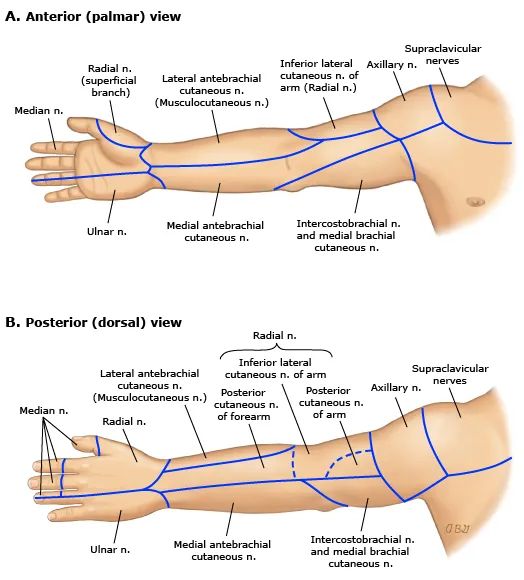 神经支配--臂丛神经的分支提供肩部以下手臂的神经支配,但上臂内侧除外(肋间神经,T2)。上肢的皮肤感觉神经支配如图所示(图 5)。