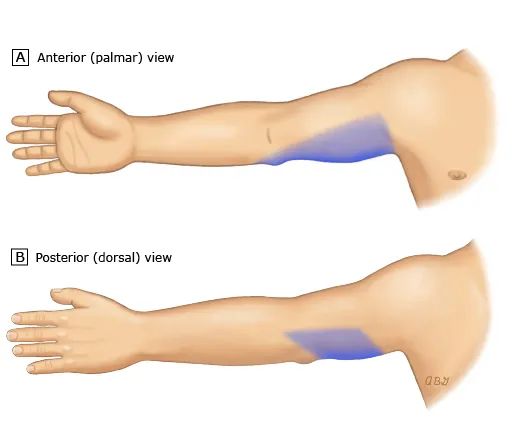 肌皮神经阻滞有时被认为是腋窝臂丛神经阻滞的一个独立阻滞,因为它与其他神经略有分离。然而,由于肌皮神经在肘部屈曲和前臂外侧感觉神经支配中的作用,因此在对肘部、前臂或腕部进行手术麻醉时,应始终对其进行阻滞。如本文所述,它将被视为腋窝臂丛阻滞的重要组成部分(图 7 )。
