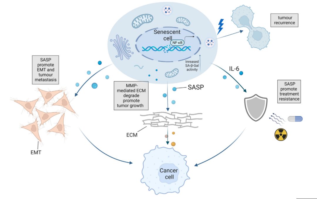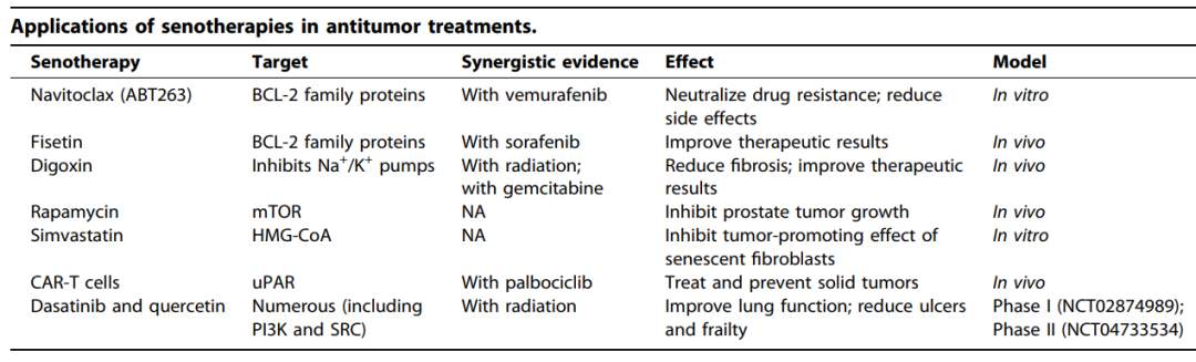 细胞衰老是一种公认的抗肿瘤反应,与化疗和放疗相比,治疗诱导衰老(TIS)已被证明是一种更安全的治疗策略。然而,衰老与肿瘤之间的关系非常复杂,越来越多的证据表明,尽管衰老在疾病早期有利于抑制肿瘤的发生,但衰老肿瘤细胞的长期存在往往会诱导肿瘤的发生、转移和复发。此外,衰老是一种不可逆的细胞周期停滞,肿瘤细胞的衰老逃逸是抗肿瘤治疗失败和肿瘤复发的重要原因。鉴于SNCs在促进肿瘤发展中的作用,及时清除SNCs在抗肿瘤治疗中至关重要。目前针对SNCs的疗法已经在开发中,这种方法的出现为抗肿瘤治疗,特别是衰老诱导治疗带来了新的机会。