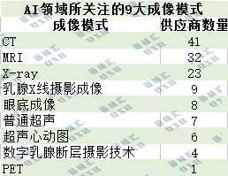 目前,医学成像AI的主要应用集中在自动化、加速以及增强图像分析,其中医学成像AI公司最关注的成像方式是CT和MRI(表1)。
