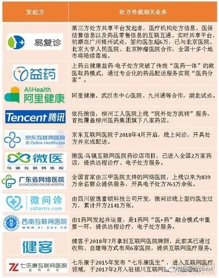 从官方“模板”到具体实践,不乏众多的探索者,如易复诊第三方处方共享平台、上药云健康参与的社区综改项目、阿里健康网络医院模式、腾讯广西柳州工人医院试点、京东互联网医院+电商模式、微医“药诊店”等处方外流项目。这些项目主要分际在于处方来源和药品提供方,各有两类来源,即实体医院/互联网医院、药店/医药电商。