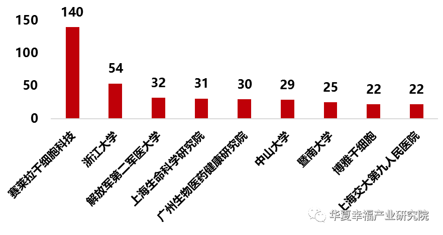 对于各城市研发机构的深入分析可以发现,干细胞的论文发表全部来自于高校,而且40%的高校是与医学相关,这可能是因为干细胞技术与医疗强关联的属性,吸引医学相关院校进行基础研究;另一方面,也可能是由于医学类院校具有大量临床资源,方便进行干细胞相关的基础研究。在专利申请机构方面,依然以科研院所为主,但是个别潜心于干细胞领域的企业专利申请数量遥遥领先。