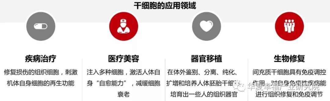 干细胞因为具有强大的复制、分化能力,因此在疾病治疗、医学美容、器官移植、生物修复四大医疗健康领域有着突出的应用前景: