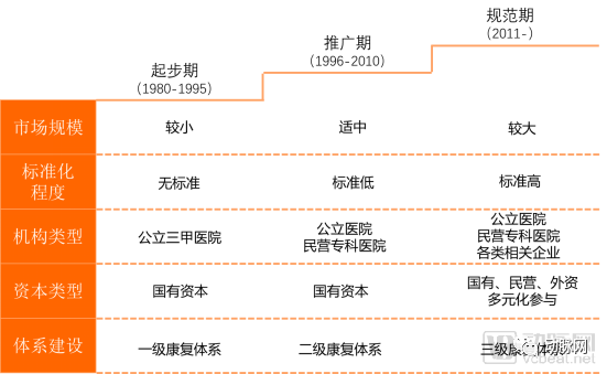 我国在20世纪80年代引入现代康复医疗体系,经过近40年的发展,在康复医疗服务方面取得了进步,根据康复市场规模、标准化程度、机构类型、资本类型、体系建设等指标,将康复医疗的发展分为起步期、推广期和规范期3个阶段,每个阶段康复医疗都呈现出不同的特点。