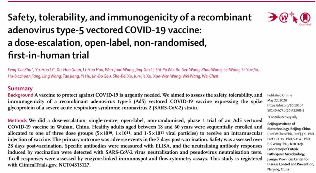 顶级医学期刊《柳叶刀》选在了5月22日晚上9点多的时间,在线发表了陈薇院士为通讯作者的、全球首个重组腺病毒5型载体新冠疫苗人体临床试验结果(I期)报告文章。