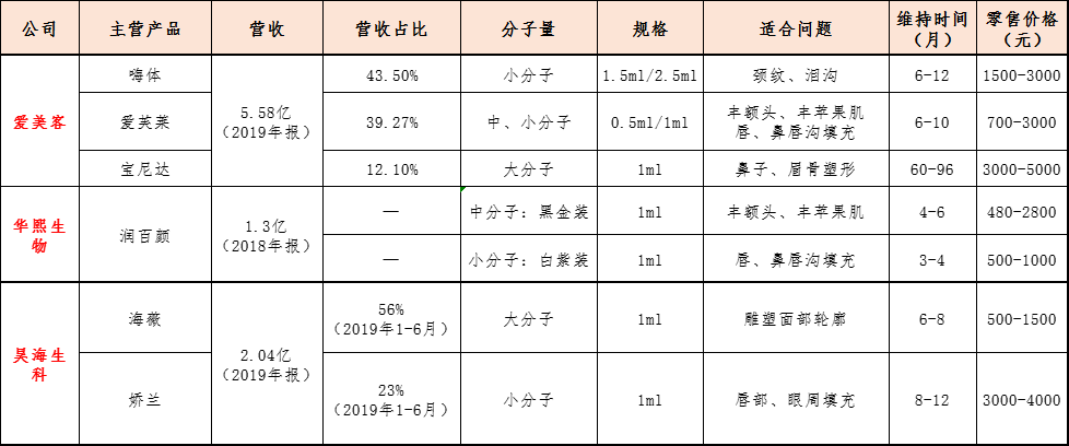 图3:A股三大公司玻尿酸填充主营产品比较。数据来源:网络、财报等