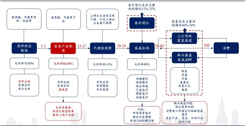 根据兴业证券经济与金融研究院关于医美行业产业链图,目前上市公司布局原材料供应和医美产品制造的企业,包括华熙生物、昊海生科、焦点生物(被鲁商发展(SH:600223)收购)和刚上市的爱美客。但全面布局的只有华熙和昊海。