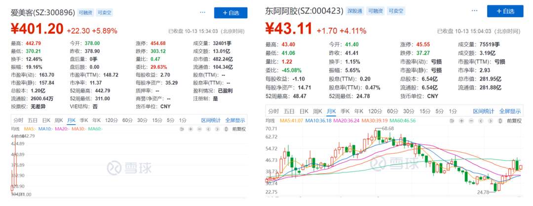 图2:爱美客与东阿阿胶市值比较。来源:雪球