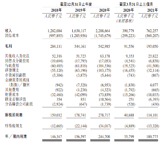 财务方面,于往绩记录期间,公司的所有收入均来自销售高性能钕铁硼永磁材料。截至2018年、2019年及2020年12月31日止年度以及截至2020年及2021年3月31日止三个月,公司产生的总收入分别为人民币(下同)12.82亿元、16.3亿元、22.89亿元、3.91亿元及7.62亿元。公司的收入主要为公司销售产品的已收及应收代价的公平值,并扣除增值税。