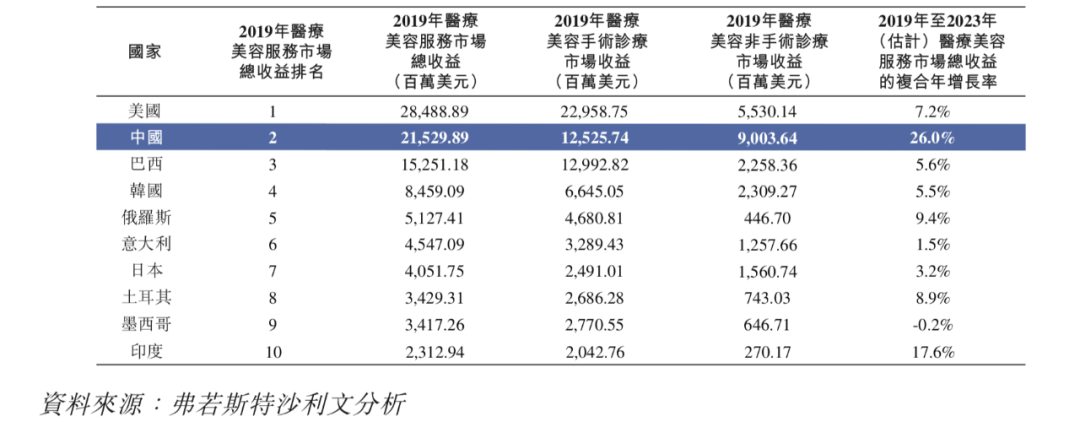 值得一提的是,中国医疗美容服务市场的总收入预计在2019年至 2023年期间将以26.0%的复合年增长率增长,成为全球十大市场中增速最快的市场。