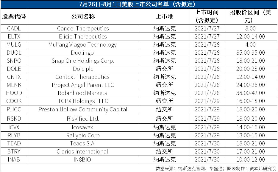 截至北京时间7月27日16点,本周(7月26日-8月1日)预计将有17家公司在美股上市,包括Dole(都乐)、Robinhood Market等,但其中无中概股。本周港股方面,目前已有理想汽车通过聆讯,暂无港股公司拟上市或开启招股,以下为全名单。