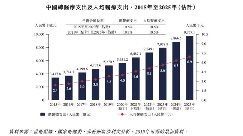 伴着经济发展的强劲东风,过去五六年中国总医疗支出及人均医疗支出以10.6%的复合增长率平稳快速增长,2020年支出总额已至5.65万亿元,该增长率将会维持到至少2025年,医疗市场总额将被推上9.74万亿的又一高点。