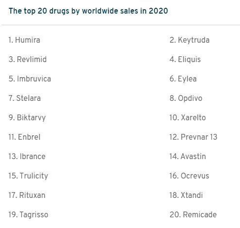 2020年全球畅销前20药物(来源:Fiercepharma)