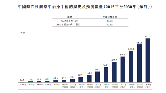 由此也催生出一个巨大的神经介入医疗器械蓝海市场。归创通桥的蛟龙颅内取栓支架便是治疗中风的一种微创器械,能帮助医生准确捕获血栓。弗若斯特沙利文数据表明,中国缺血性脑卒中治疗手术的数量由2015年的13.5千台增至2019年的45.8千台,预计于2030年将进一步增至881.3千台,市场经济规模达到371亿元。