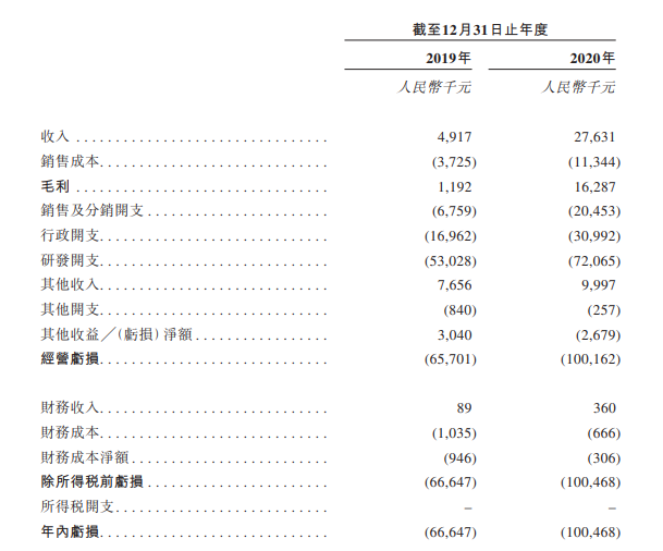 然而由于销售及分销开支、研发开支以及与公司持续经营相关的行政开支所产生的成本,2019年和2020年连续两年净亏损,年内亏损金额分别约为6,664.7万元、10,046.8万元。