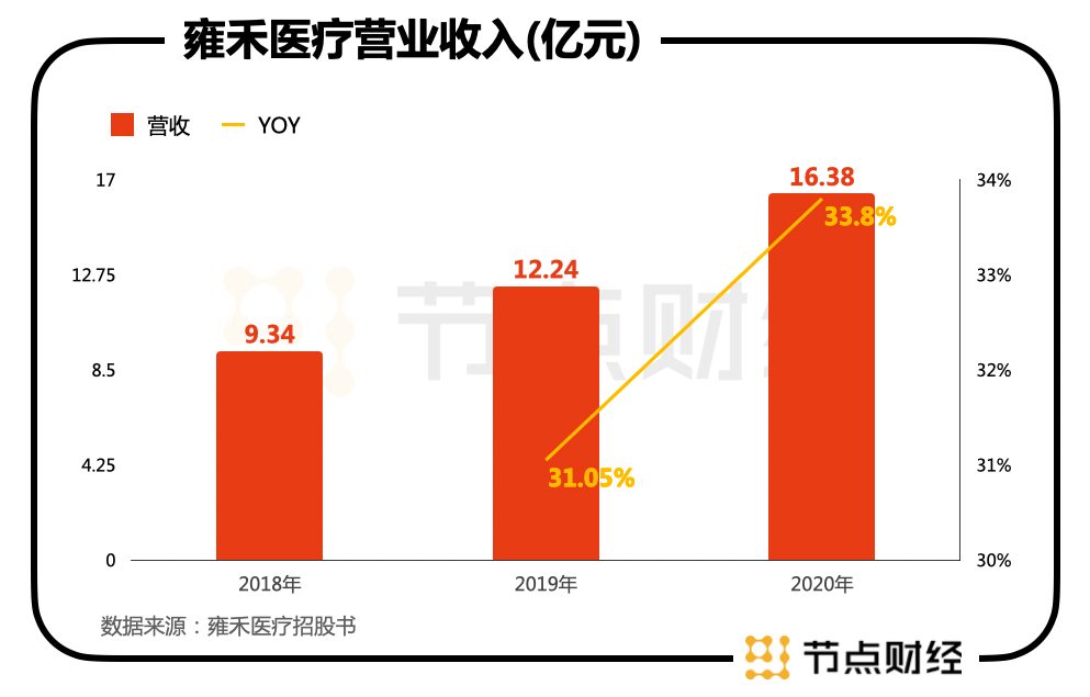 具体来看雍禾医疗的财务数据,招股说明书显示,2018年,雍禾医疗营收为9.34亿元;2019年,达到12.24亿元,同比增长31%;2020年,达到16.38亿元,同比增长33%以上。