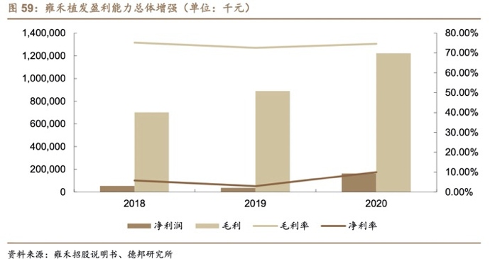 而从招股说明书来看,对于雍禾医疗来说,植发的利润相当可观。2018-2020年,雍禾医疗毛利率分别高达75.1%、72.6%、74.6%。这远远超过当前资本市场炙手可热的医疗服务白马股,比如爱尔眼科(46%-51%)、通策医疗(41%-46%)的毛利率。