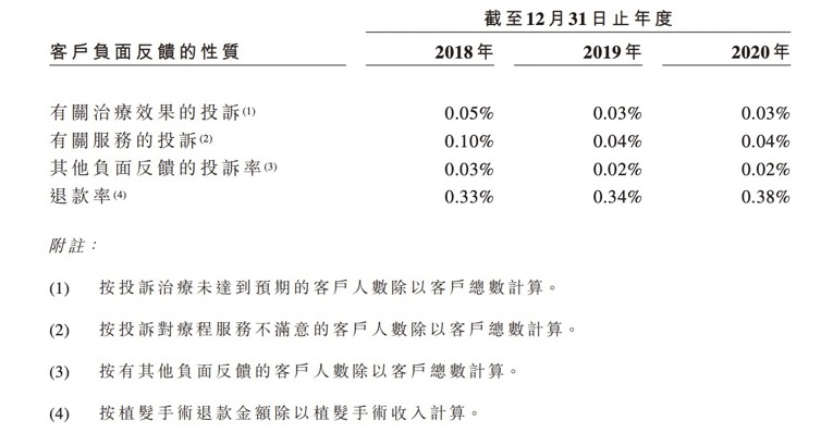 招股说明书显示,雍禾医疗在2018-2020年间,收到的客户负面反馈集中在治疗效果及服务方面,近三年退款率分别为0.33%、0.34%、0.38%。