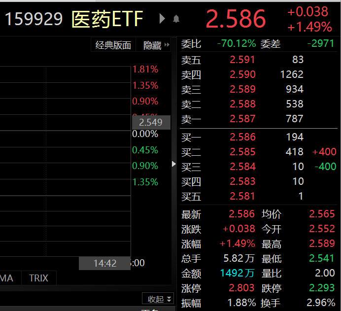 据悉,截至发稿,医药ETF(159929.SZ)今日上涨1.49%。